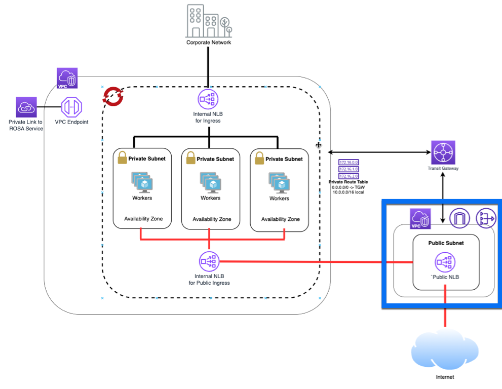 A fundamental aspect of this architecture is the creation of a second Ingress Controller to manage routing for applications exposed to the Internet. This Ingress Controller is configured as a private AWS Network Load Balancer. The decision to keep it private serves two primary purposes: first, it prevents direct access to the cluster and applications from the Internet; second, by directing traffic through a public ingress VPC initially, you can centralize Internet access control for your environment and implement your organizational security standards, including inspection, WAF, firewalls, and other security technologies.